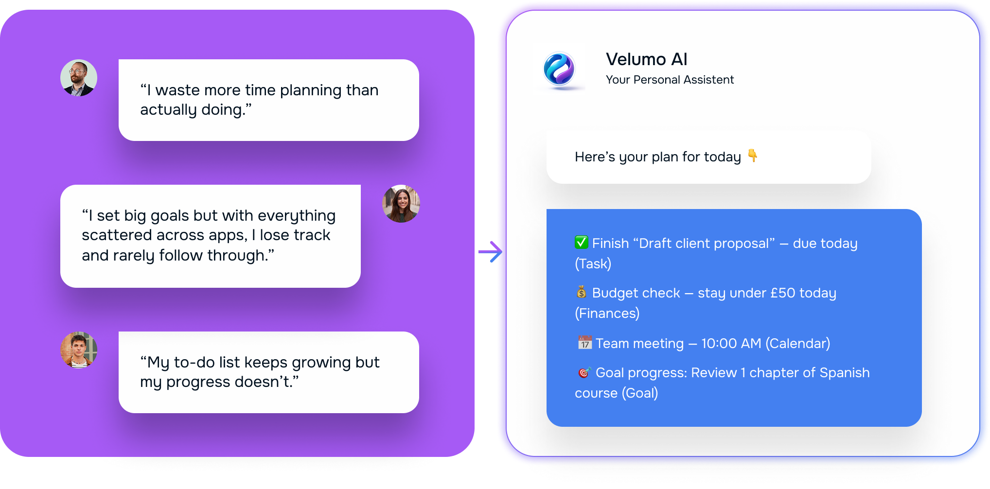 No more juggling apps. Velumo unifies your tasks, goals, finances and calendar into one intelligent flow — guided by AI that keeps you moving forward.